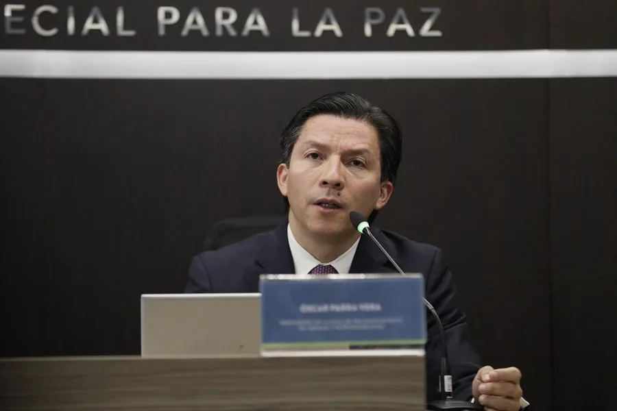 *El presidente de la Sala de Reconocimiento de la Jurisdicción Especial para la Paz (JEP), Oscar Parra, habla en una rueda de prensa en Bogotá (Colombia). EFE/ Carlos Ortega