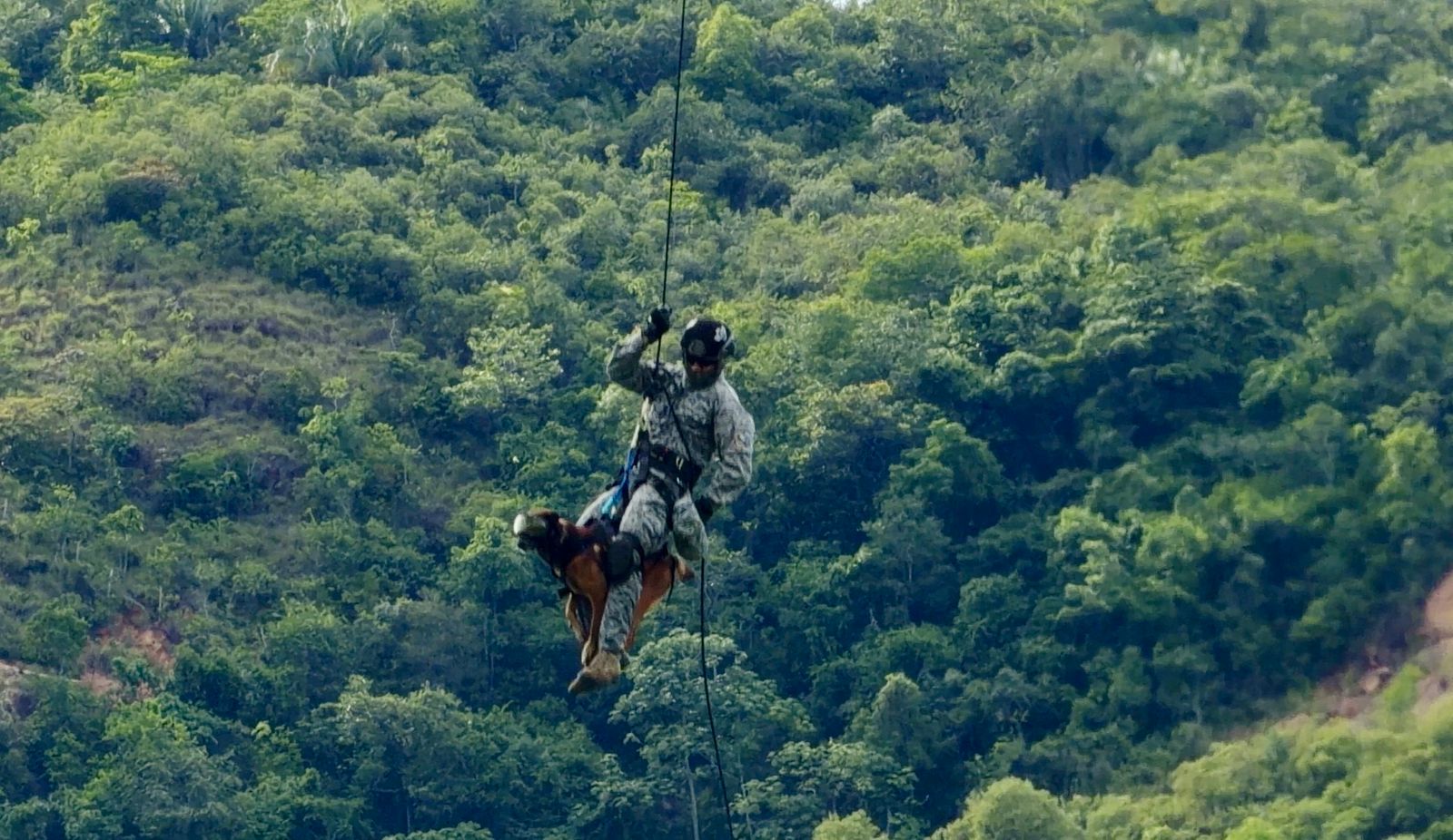 La escena se repite luego con la maniobra spies, que por primera vez en la historia de la Fuerza Aeroespacial Colombiana se ejecuta con un semoviente, una técnica que consiste en quedar suspendido de una cuerda mientras la aeronave se desplaza, esta capacidad es vital cuando el terreno impide el empleo de grúa o vehículos; por lo tanto, en este ejercicio el perro aprende a mantener la estabilidad, a confiar en la sujeción y, sobre todo, a sentirse seguro junto a su guía, quien permanece a su lado durante toda la maniobra.
