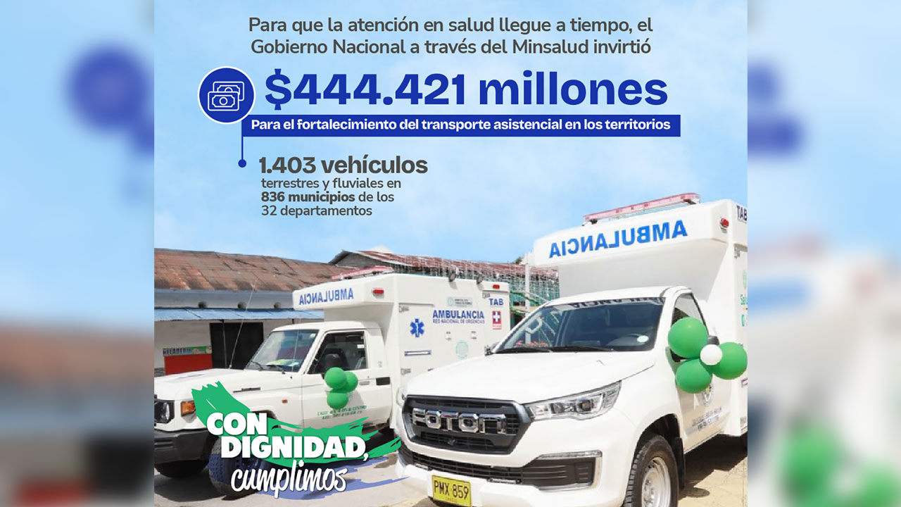 Con una inversión de $444.421millones de pesos el Gobierno del Cambio, a través del ministerio de Salud y Protección Social, adelanta uno de los principales proyectos estratégicos del sector para garantizar el transporte asistencial, incluyendo ambulancias básicas, fluviales y marítimas. Esta estrategia de fortalecimiento de la atención en salud asegura que millones de ciudadanos, ya sea en el campo o a las orillas de los ríos, reciban atención en salud oportuna y de calidad a lo largo de todo el territorio colombiano.