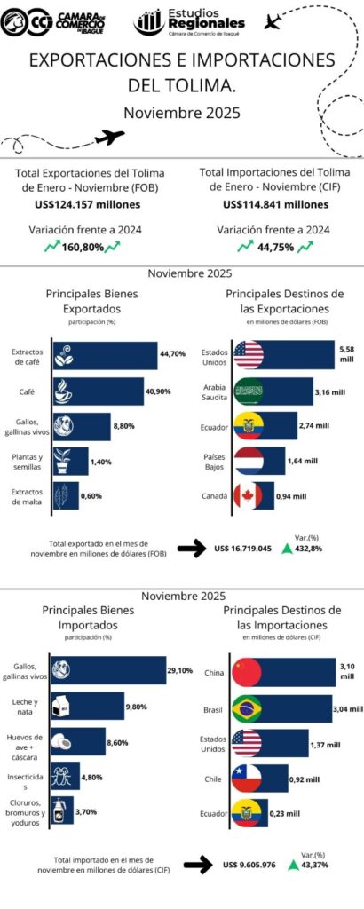 Un significativo crecimiento tuvo el volumen de exportación de productos del departamento del Tolima, durante el mes de noviembre de 2025, según estadística divulgada por la Cámara de Comercio de Ibagué.