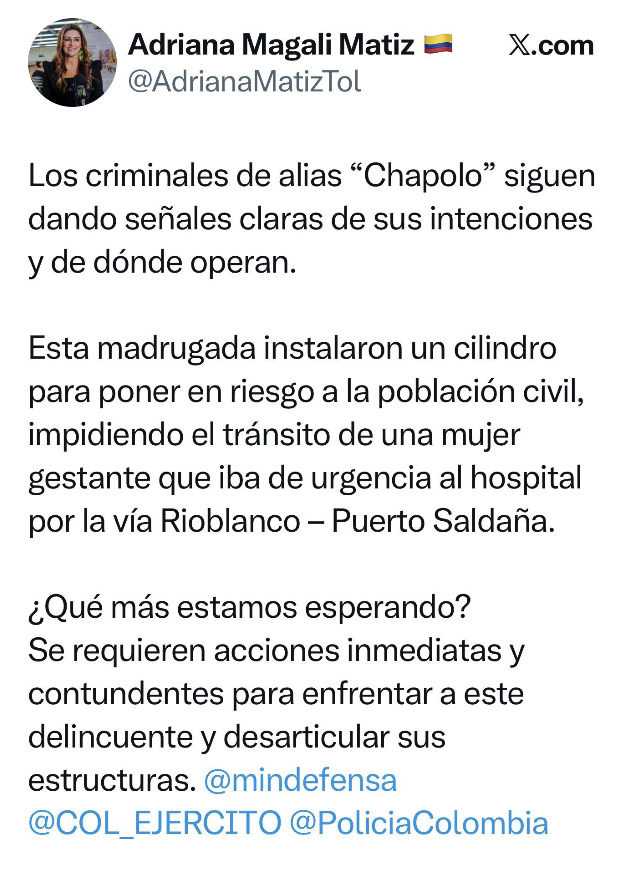 La gobernadora del Tolima, Adriana Magali Matiz, reprochó el hecho a través de las redes sociales y llamó la atención de las fuerzas militares y de control , para que se actúe de manera que se puedan contrarrestar este tipo de acciones.
