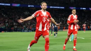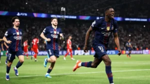 Primero, una gran acción coral de los vigentes campeones permitió a Achraf Hakimi llegar libre de marca al área por banda derecha, desde donde centró al segundo palo para que Kvaratskhelia, libre de marca y al primer toque, ampliase la diferencia en el marcador. Esto dejó tocado al Bayern, que dos minutos después vio como Dembélé, con un preciso remate al palo corto que tocó en la madera, anotó el quinto del Paris desatando la locura en el Parc des Princes.